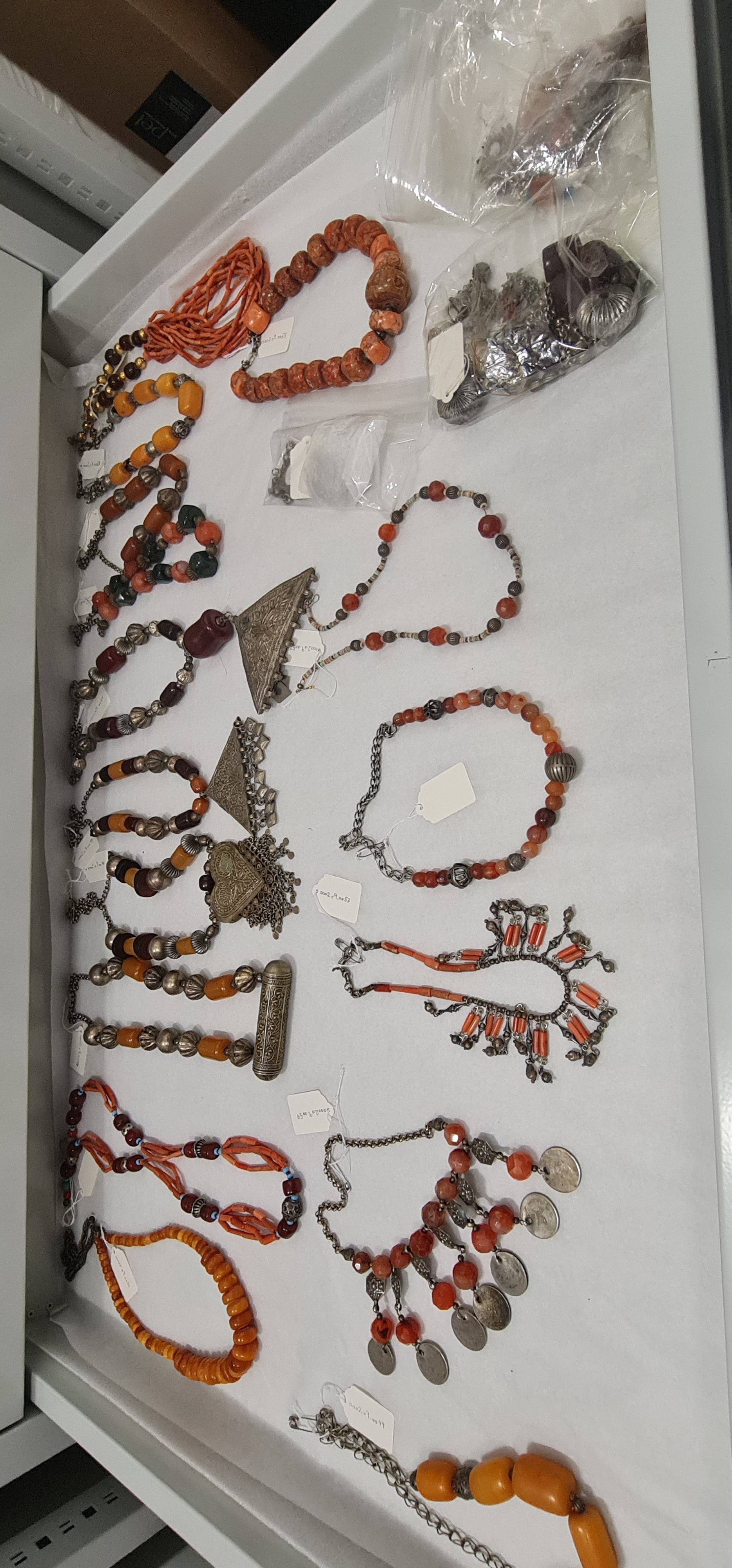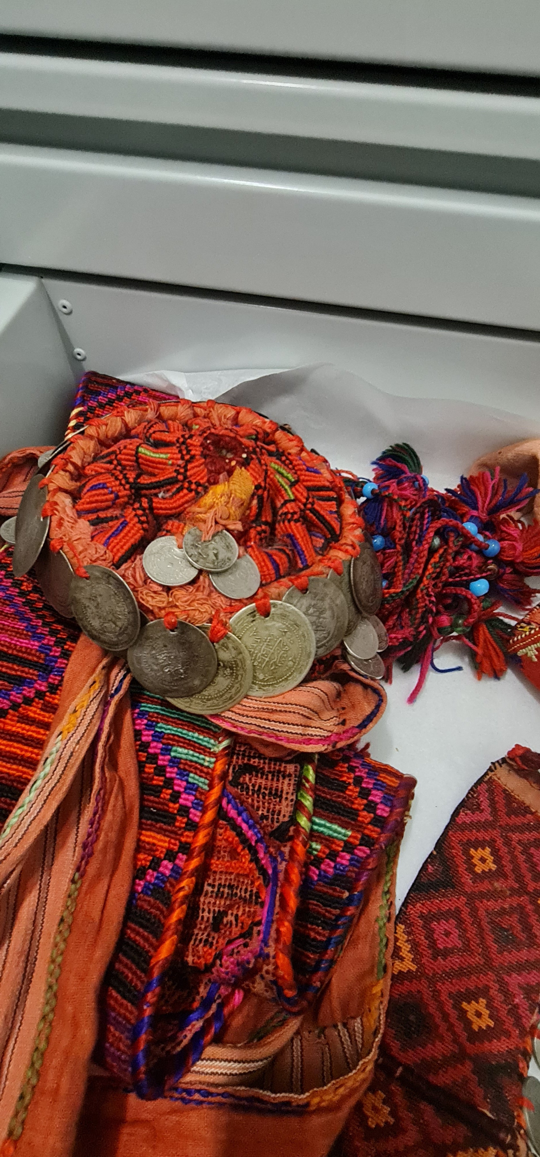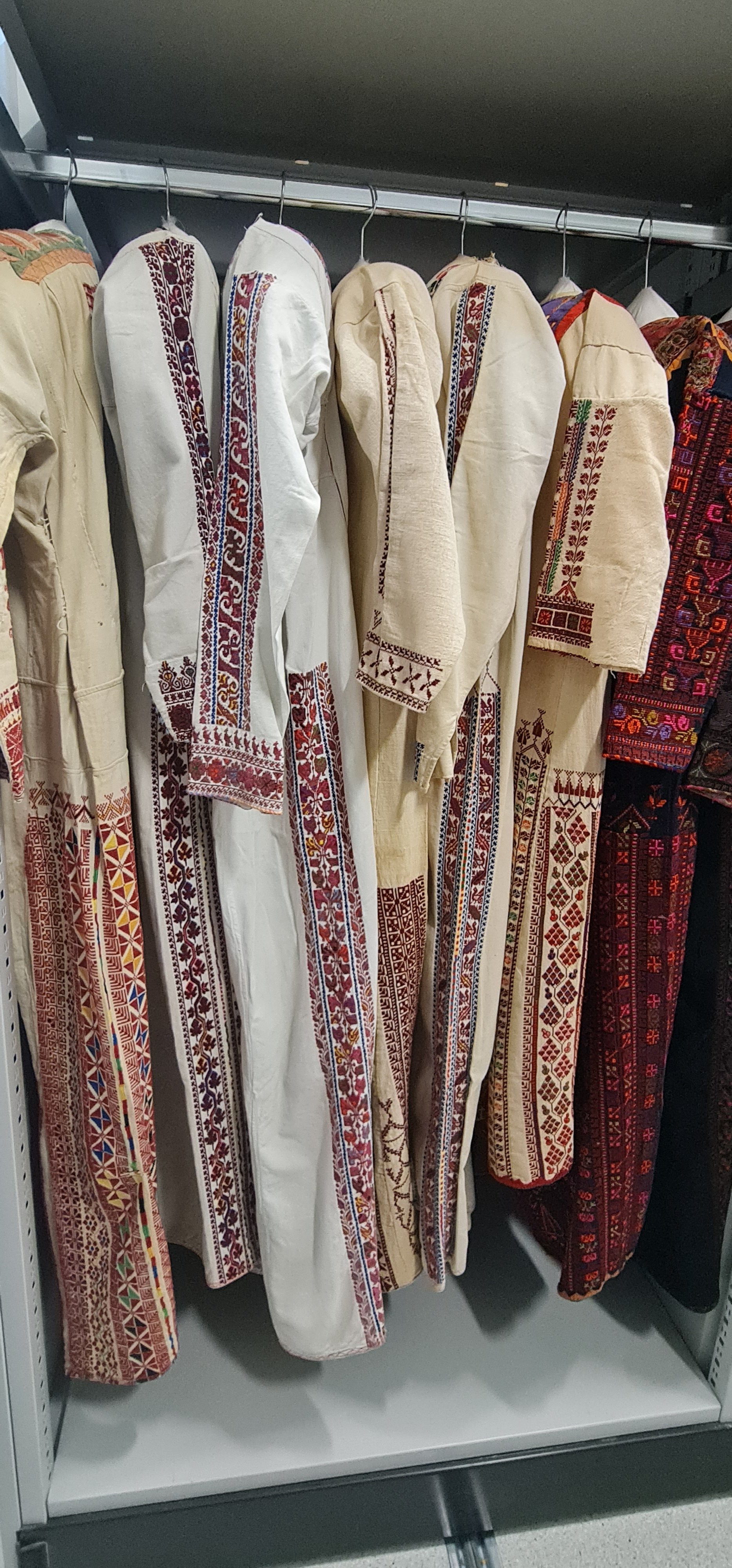 Son olarak Filistin nakışının ve aksesuarların sergilendiği bölümdeyiz. Kültürel özelliklerine sahip çıkmaya çalışan Filistinliler sergilenen bu yöresel kıyafetlerle tarihlerine ışık tutuyorlar. Kırmızı rengini ağırlıkla kullanan Filistinliler bugün hala özel günlerinde yöresel kıyafetlerini giyiyorlar. Yöresel aksesuarlardan cevşenli kolyeler, gümüş takılar ve akik taşları yine bu bölümde sergileniyor.