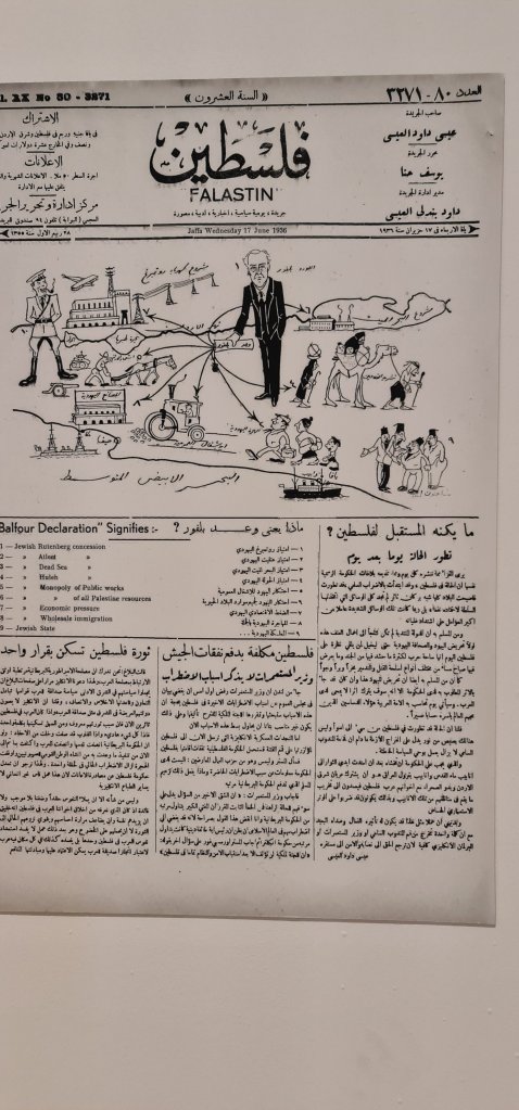 Fotoğrafların arasında bir de broşür görüyoruz. ‘Balfour Deklarasyonu’.. Filistinlileri evlerinden eden, Israillileri ise o evlere yerleştiren Nakba sürecinin en önemli adımlarından biri bu bildiri; Yahudi sorununa , Siyonizme ve Filistin’deki Yahudi göçüne değinmekte.