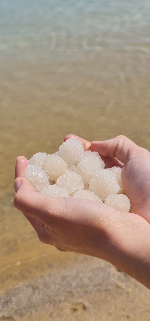 Suyun içine batmadan toplayabileceğiniz küre şeklindeki tuzlarla da evinizde güzel bir hatıra köşesi oluşturabilirsiniz.
