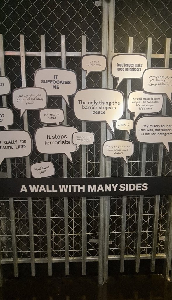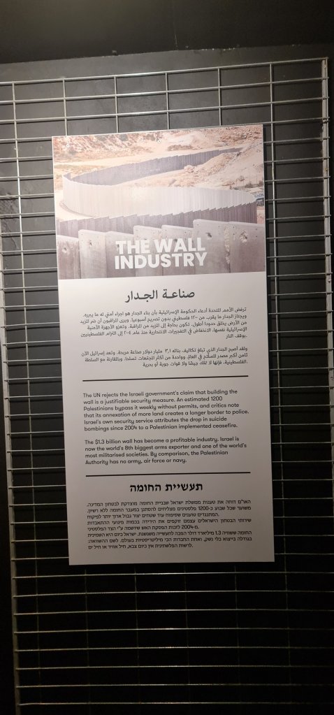 Ayrıca Filistinliler için bugün hayatı zorlaştıran check – point (Yukarıda belirttiğim gibi grevyer peynirinin deliklerine doğru ilerlerken , yani Israil’den Filistin’e geçerken check point noktalarında hiçbir kontrol mekanizması olmadığını fakat Filistin’den Israil’e asla elinizi kolunuzu sallayarak geçemediginizi belirtmek isterim) , ID kontrolü ve duvarlar gibi unsurları anlatan materyaller bulunuyor.