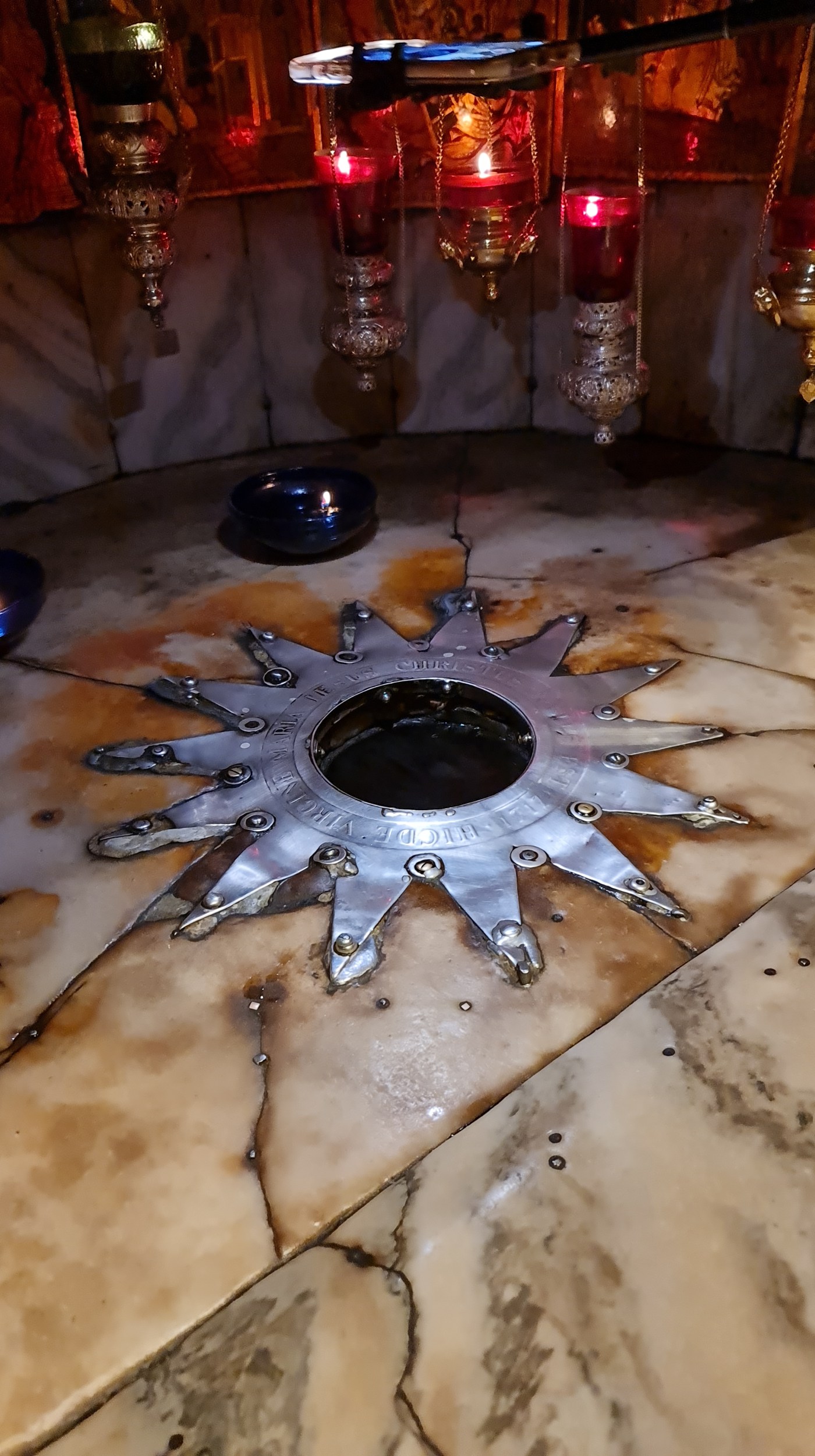 Kilisenin altında yer alan bir yeraltı mağarasına iniyoruz : Doğuş Mağarası, İsa’nın doğduğu söylenen yer. Kesin nokta, bir sunağın altında 14 köşeli bir işaretle işaretlenmiştir. Bu yıldız simgesi çobanların şahit olduğu doğumu müjdeleyen yıldıza ithafen yapılıyor.